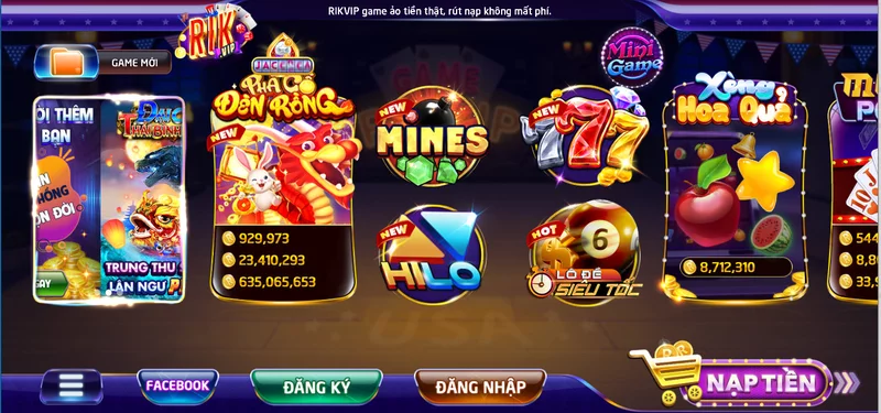 Rikvip cũng là một cái tên đình đám trong làng nohu đổi thưởng hiện nay. Địa chỉ thu hút được số lượng người tham gia trên toàn cầu, là điểm lui tới của các tay chơi game chuyên nghiệp. Rikvip được mệnh danh là sòng bạc hoàng gia với hình ảnh, âm thanh sống động như đời thực. Các sản phẩm game nổ hũ rikvip nổi bật ở đây được đánh giá là dễ chơi, dễ thắng như: Sơn Tinh Thủy Tinh, Kim cương, Bá tước quyền năng, Ăn khế trả vàng, Nightclub lady, Mỹ nữ.